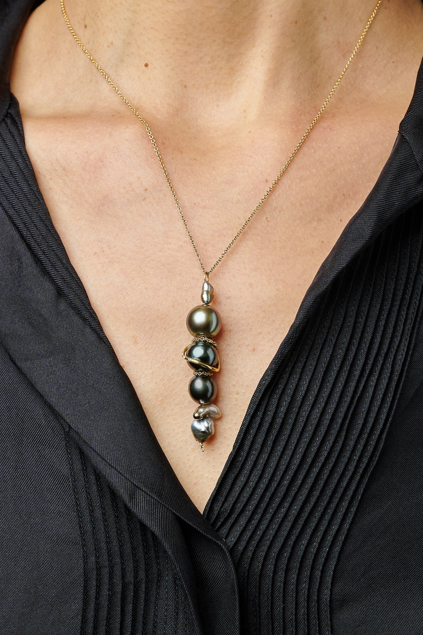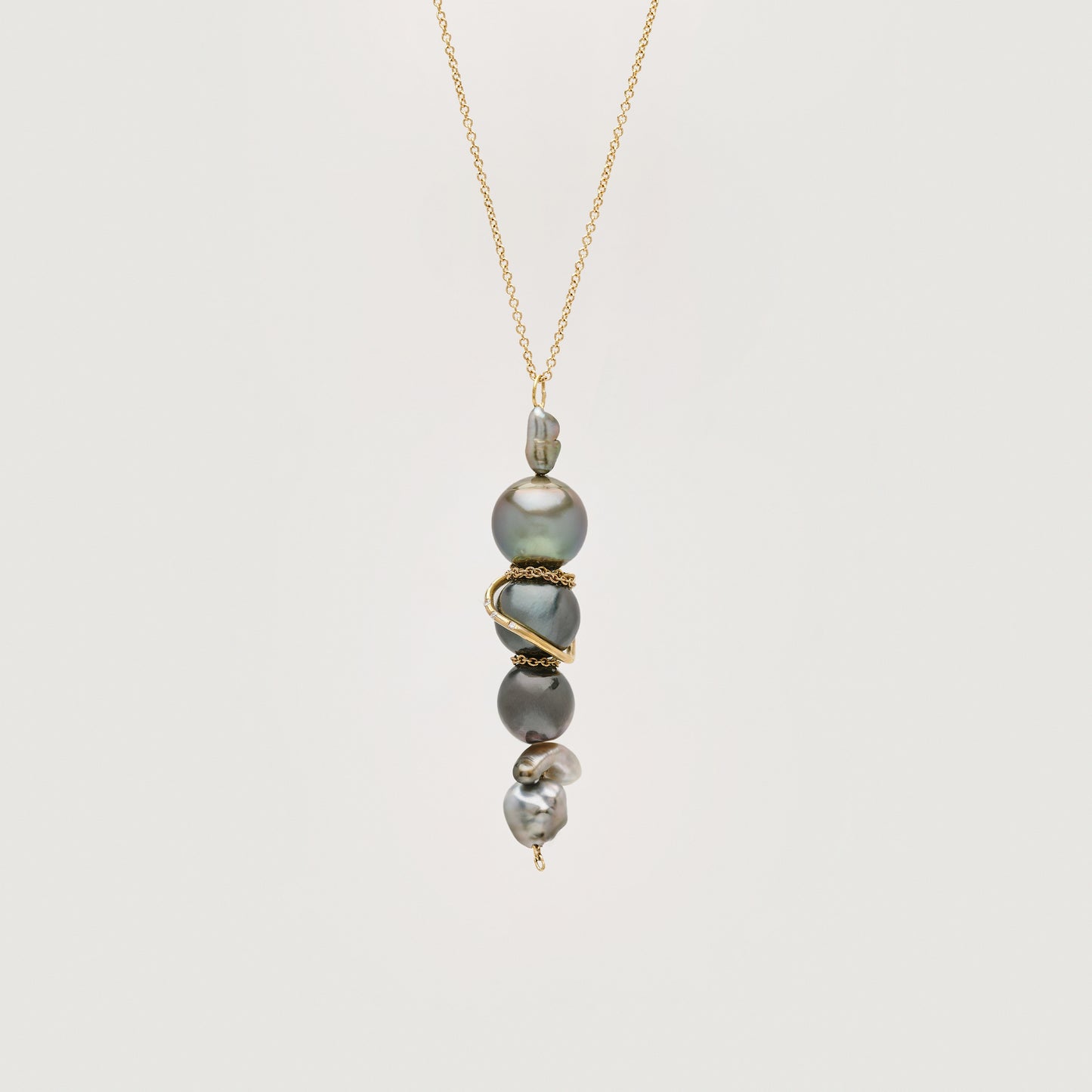 I created this piece inspired by the harmony between the sun and the moon, their dance of light and shadow. To capture this contrast, I wrapped delicate gold chains and tiny diamonds around luminous pearls, evoking the sun’s radiant glow and the moon’s soft shimmer.