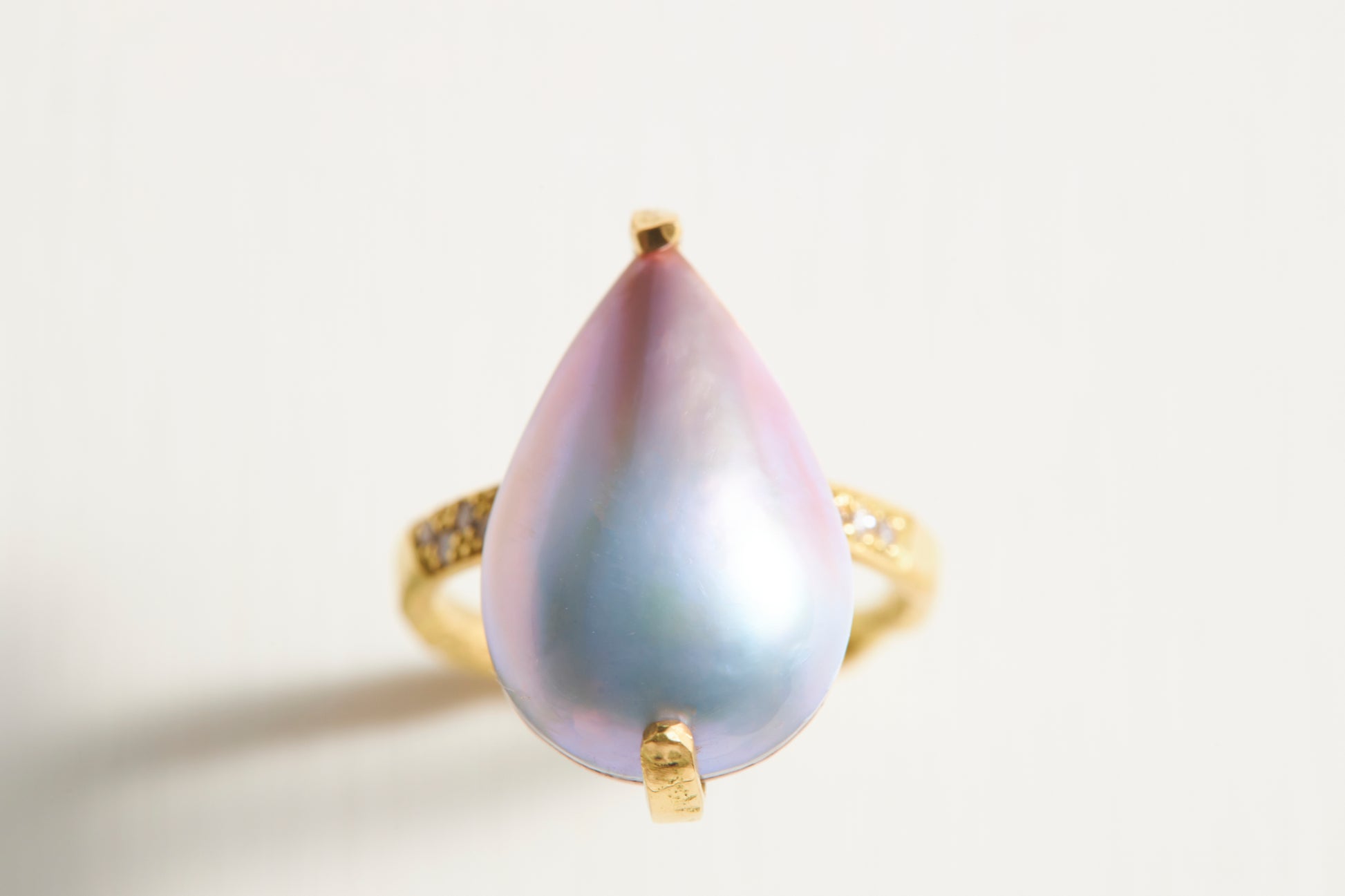 From my personal collection of pearls, I selected a rare pear-shaped gem to create this exquisite ring. Cultured in the southern region of my hometown in Japan, this pearl shimmers with a subtle iridescence that has recently drawn attention for its rarity. Captivated by its serene, seven-colored glow, I designed the ring to let its natural beauty take center stage.