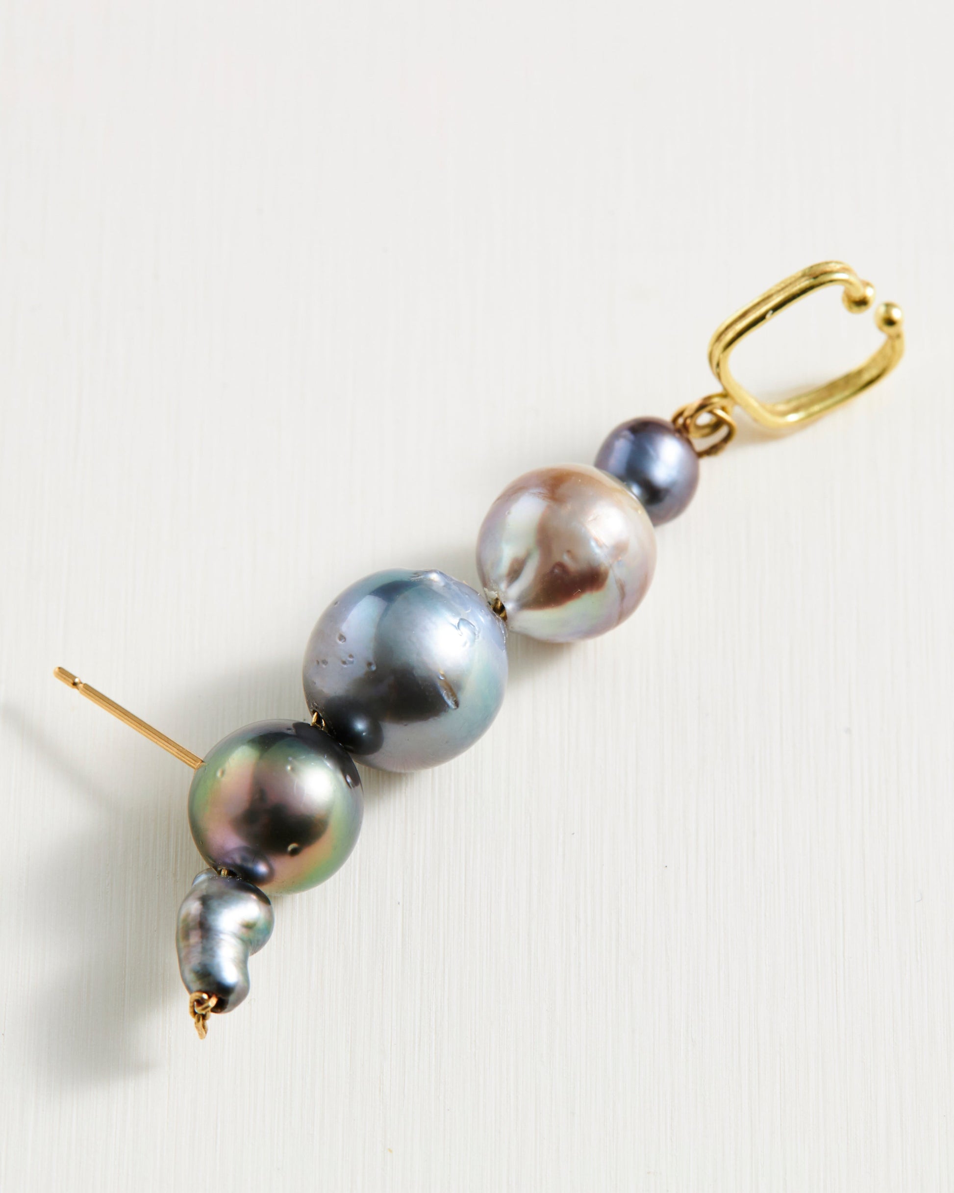 The earring is handcrafted from 18ct yellow gold and Tahitian pearls. It is sold as a single earring.