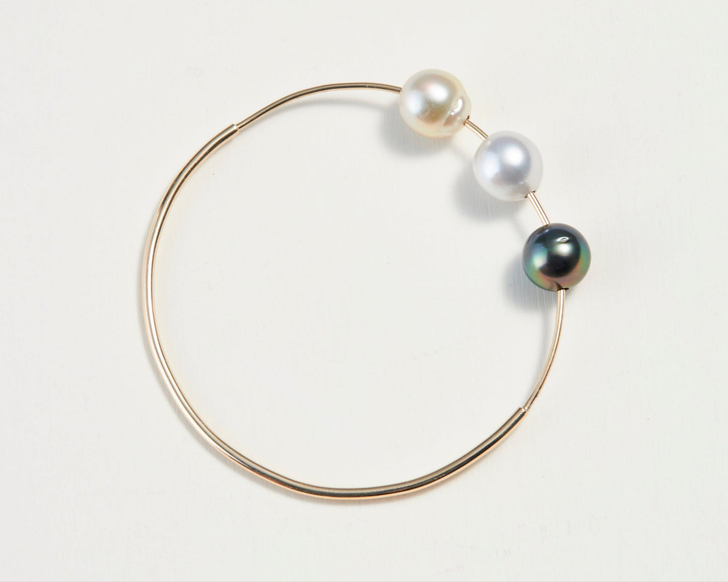 This bangle is handcrafted from 9ct yellow gold, Tahitian pearls and South Sea pearls.